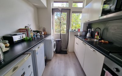 Bij binnenkomst kom je in de gezamenlijke entree, waarna het appartement zich op de eerste etage bevindt. Je stapt direct de woonkamer in van circa 19 m², die zich aan de voorzijde van het appartement bevindt. Aangrenzend aan de woonkamer is de aparte keuken van circa 7 m². De keuken is voorzien van een vaatwasser, gaskookplaat, afzuigkap en een combi-oven/magnetron.