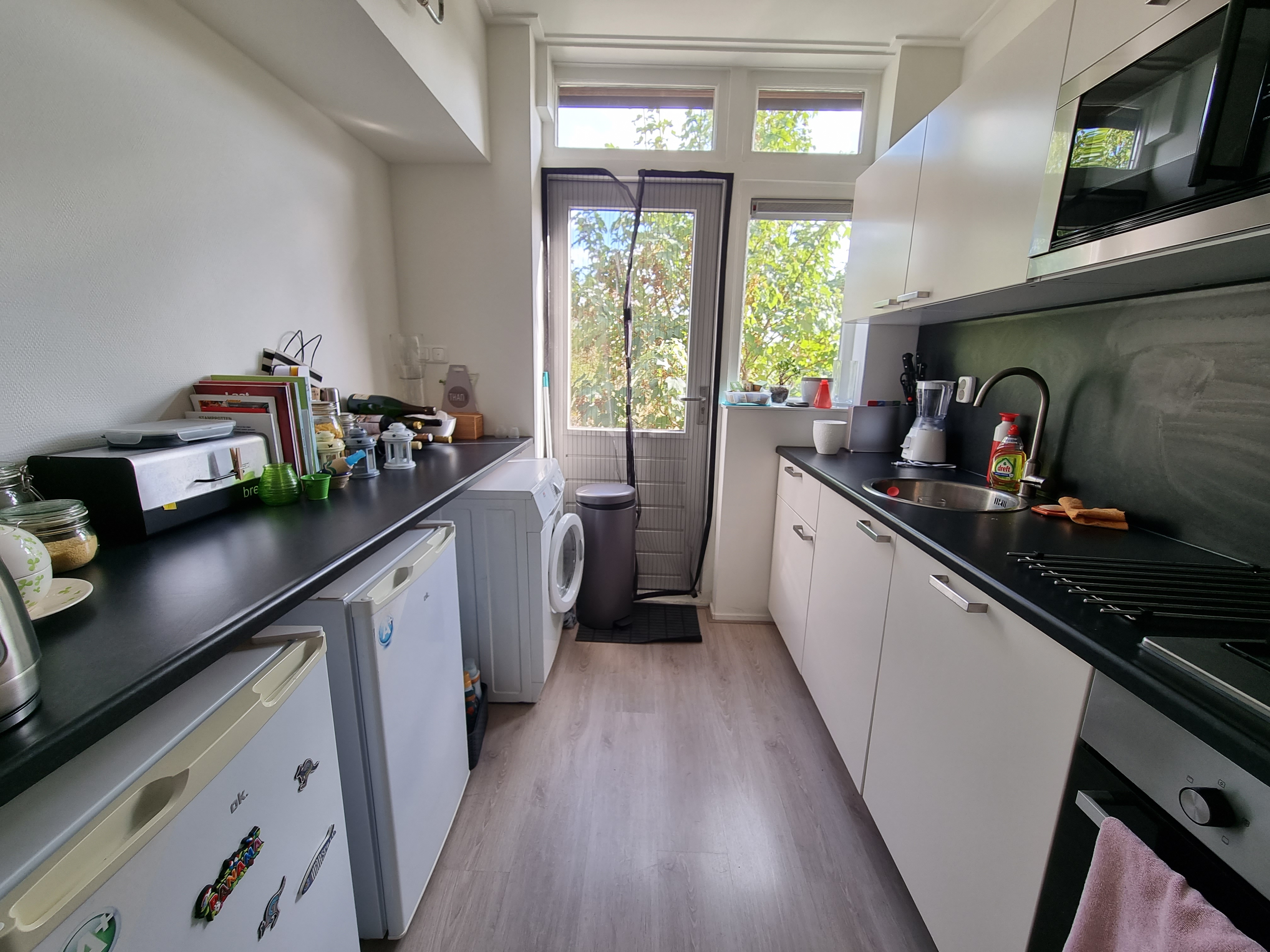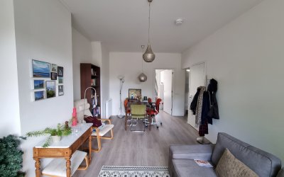 Upon entering, you arrive in the shared entrance, after which the apartment is located on the first floor. You step directly into the living room of approximately 19 m², which is situated at the front of the apartment. Adjacent to the living room is a separate kitchen of approximately 7 m². The kitchen is equipped with a dishwasher, gas stove, extractor hood, and a combination oven/microwave.