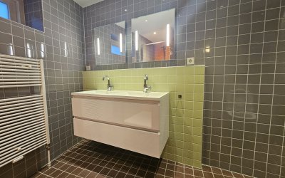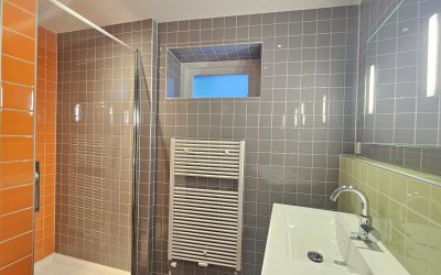 De unieke badkamer (5 m²) is uitgevoerd in een retro stijl en voorzien van luxe voorzieningen. Er is een ruime inloopdouche, een gloednieuw wastafelmeubel met twee kranen, een designradiator voor handdoeken en een zwevend toilet.