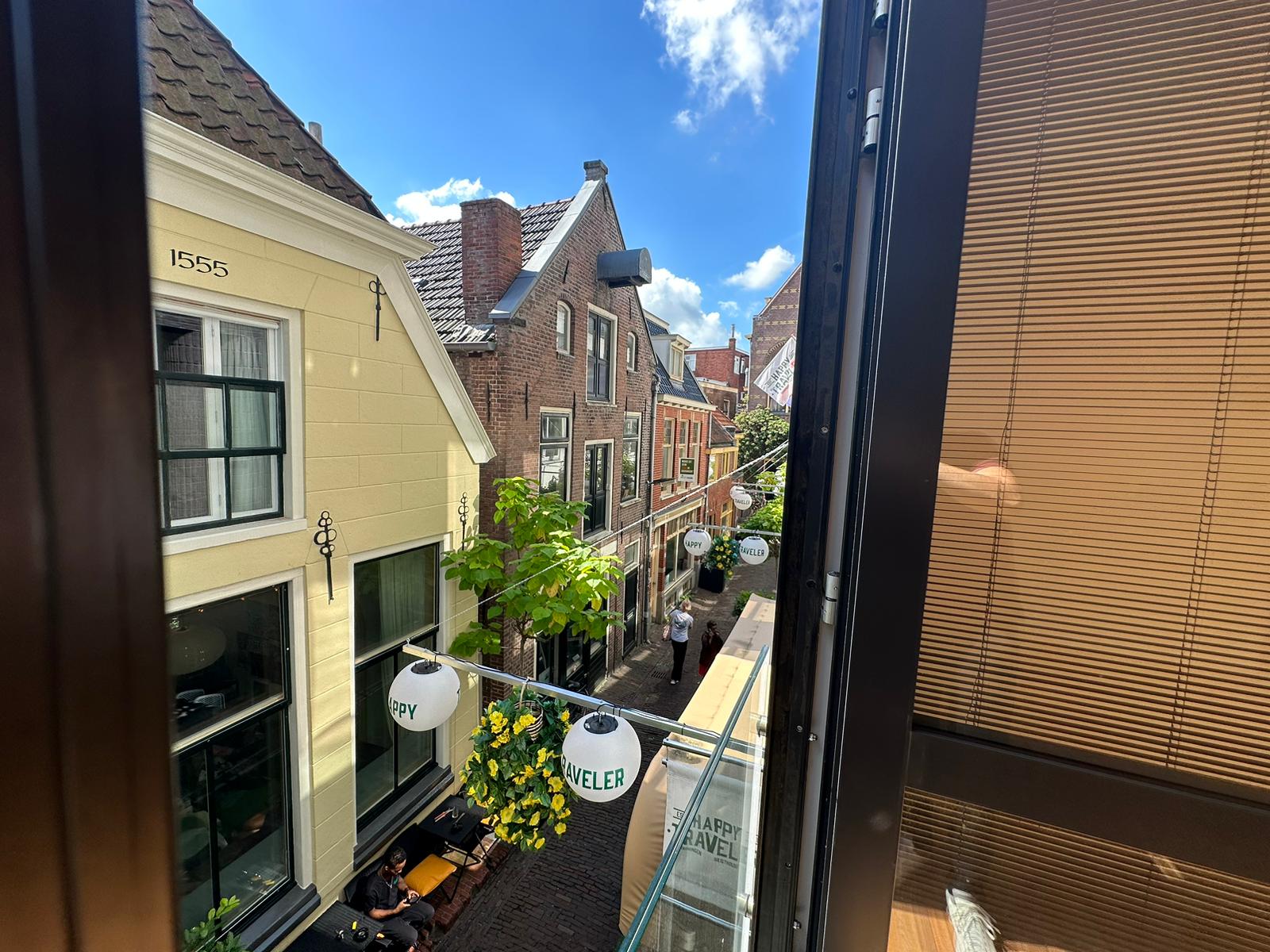 The bedroom (23 m²) features large French doors and windows, providing plenty of natural light. Through the French doors, you have a view over the charming street of Kleine Kromme Elleboog. In addition to space for a bed, the generous bedroom offers ample room for wardrobes and other furniture.