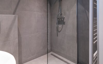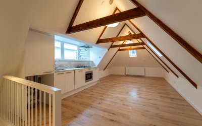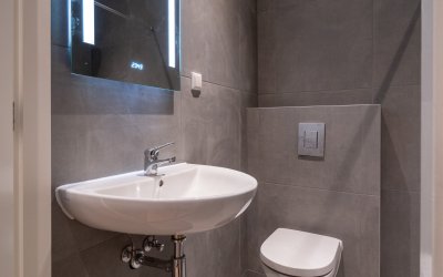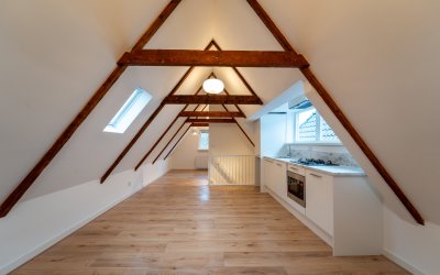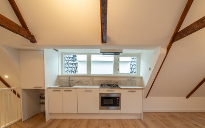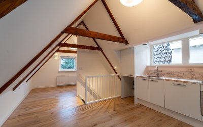 Through a shared entrance, you reach the first floor. Directly to the left of the studio’s front door is the beautifully finished bathroom. The bathroom features a separate shower and toilet. Via the stairs, you enter the studio of approximately 25 m². The kitchen is equipped with various built-in appliances, such as a gas hob, extractor fan, dishwasher, fridge with freezer compartment, and a combination oven/microwave.