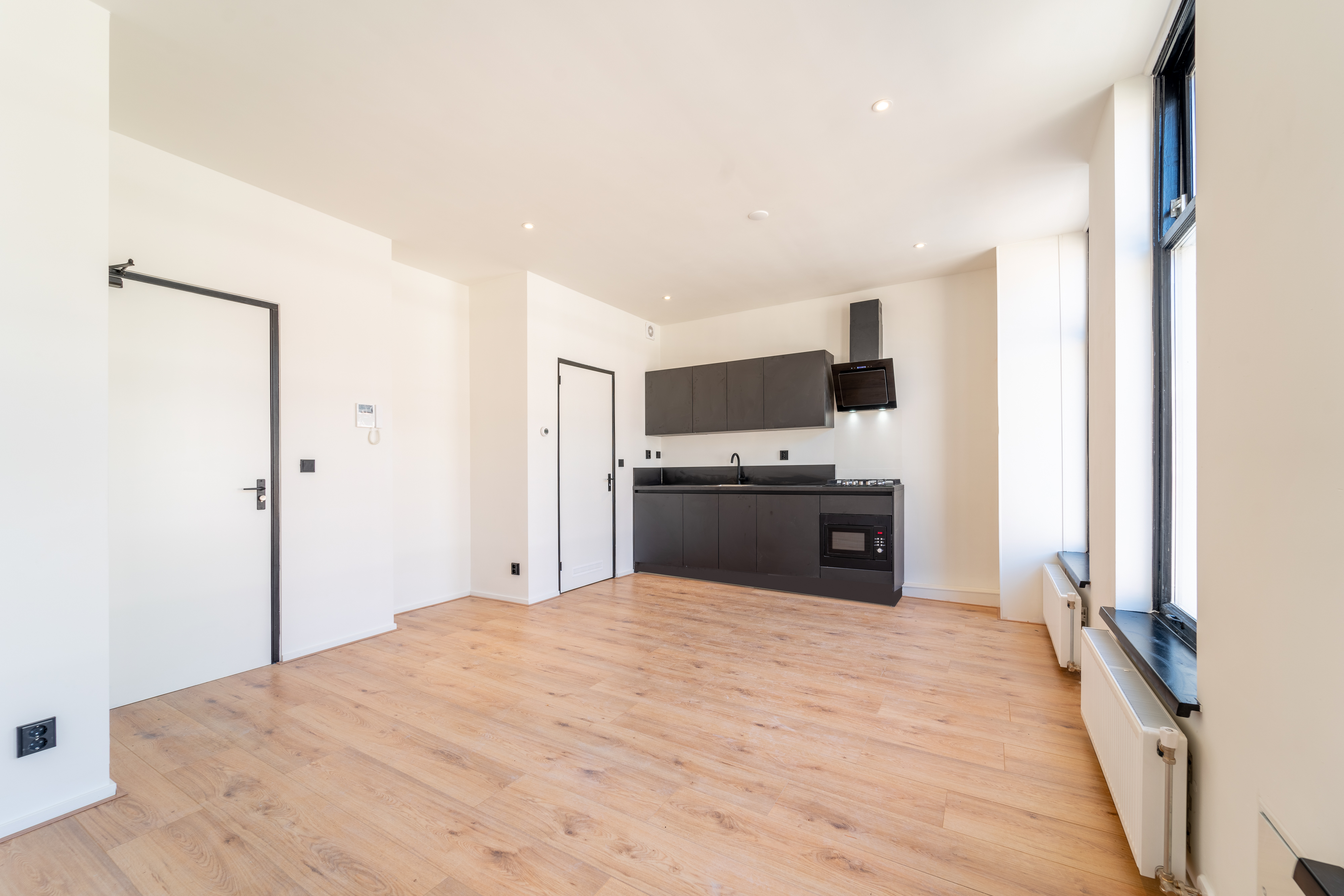 Through the studio’s front door, you enter the living room with an open kitchen of approximately 23 m². The kitchen is equipped with various built-in appliances, including an extractor hood, stove, fridge with freezer compartment, dishwasher, and a combination oven/microwave.