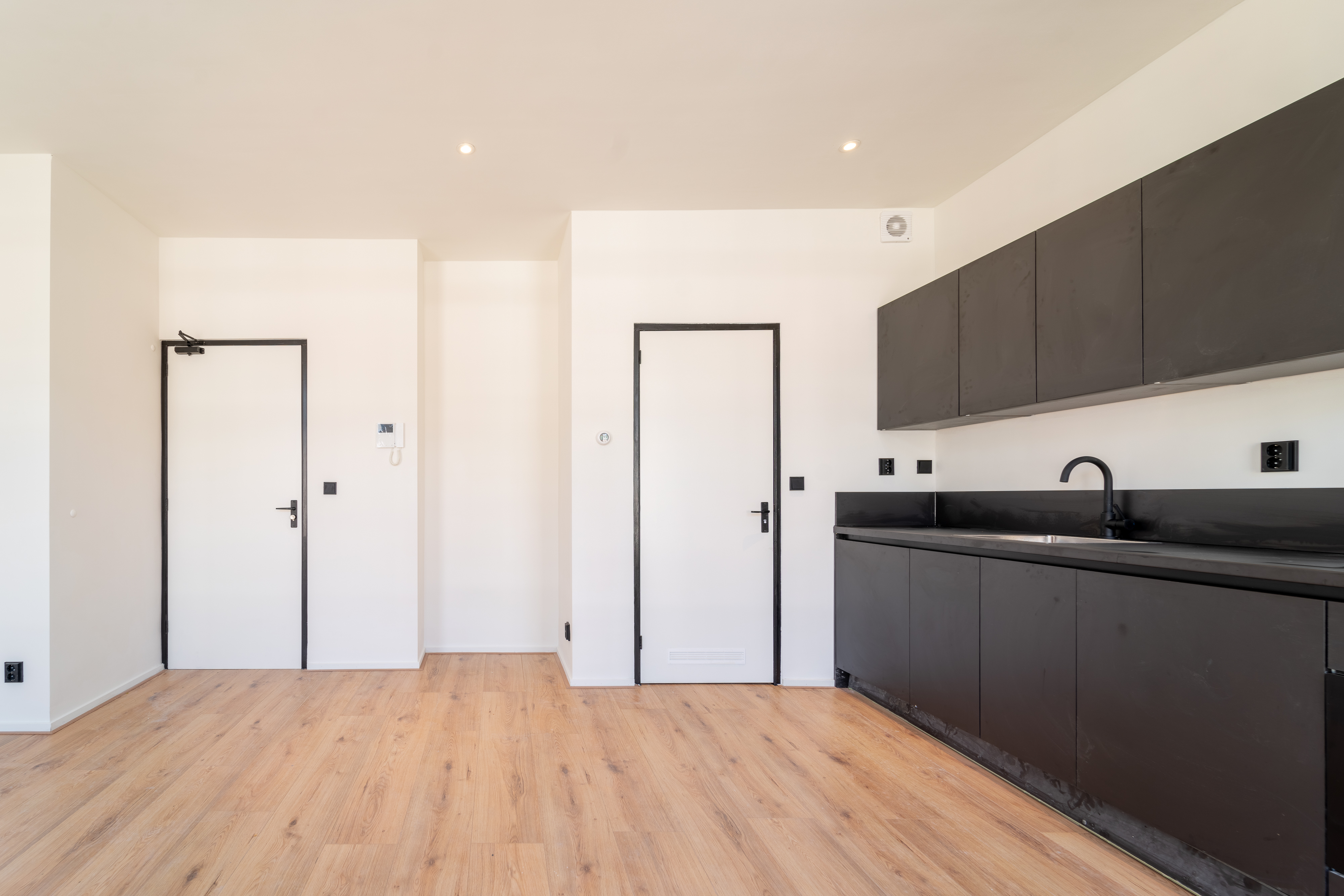 The first floor can be accessed via the shared front entrance. On this floor, you will find the entrance doors to all three studios. The shared hallway includes a communal washing machine.