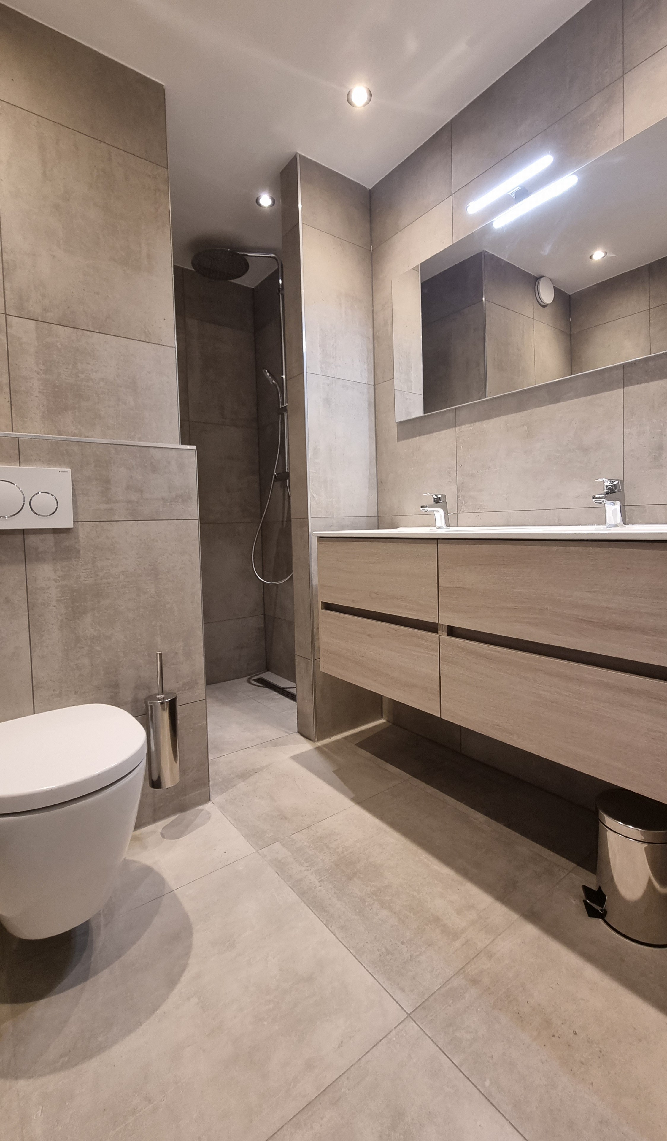 The apartment is located on the first floor. Upon entering, you step into the living room with an open kitchen. From the hallway, you can access the bedroom and bathroom. The bathroom is luxuriously finished and equipped with a walk-in shower and a wall-mounted toilet.