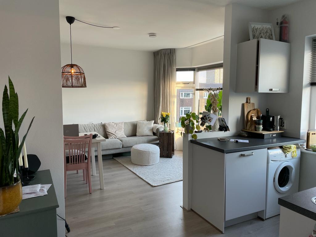 Het appartement is gelegen aan de voorzijde van de woning. De woonkamer met open keuken is ruim 21 m². De keuken is voorzien van een vaatwasser, combi-oven/magnetron, koelkast, keramische kookplaat en afzuiginstallatie.