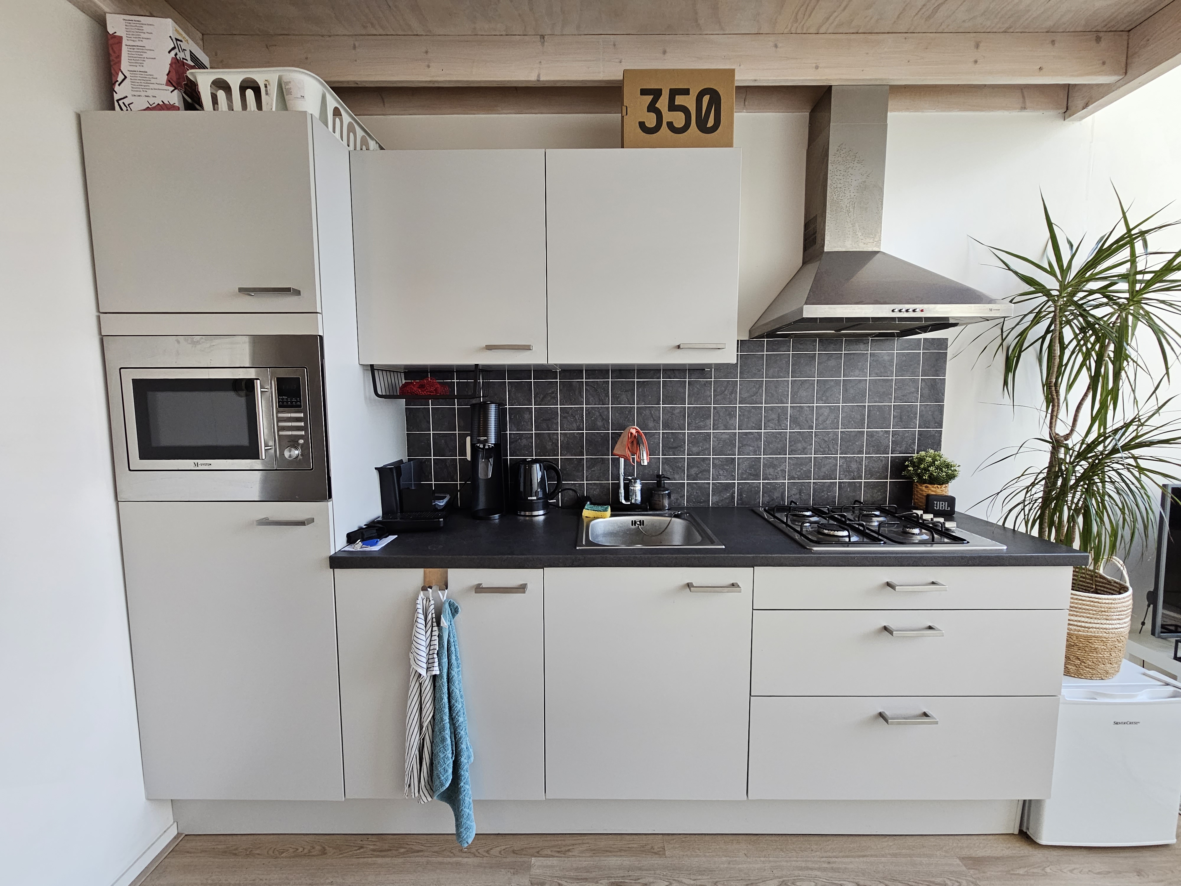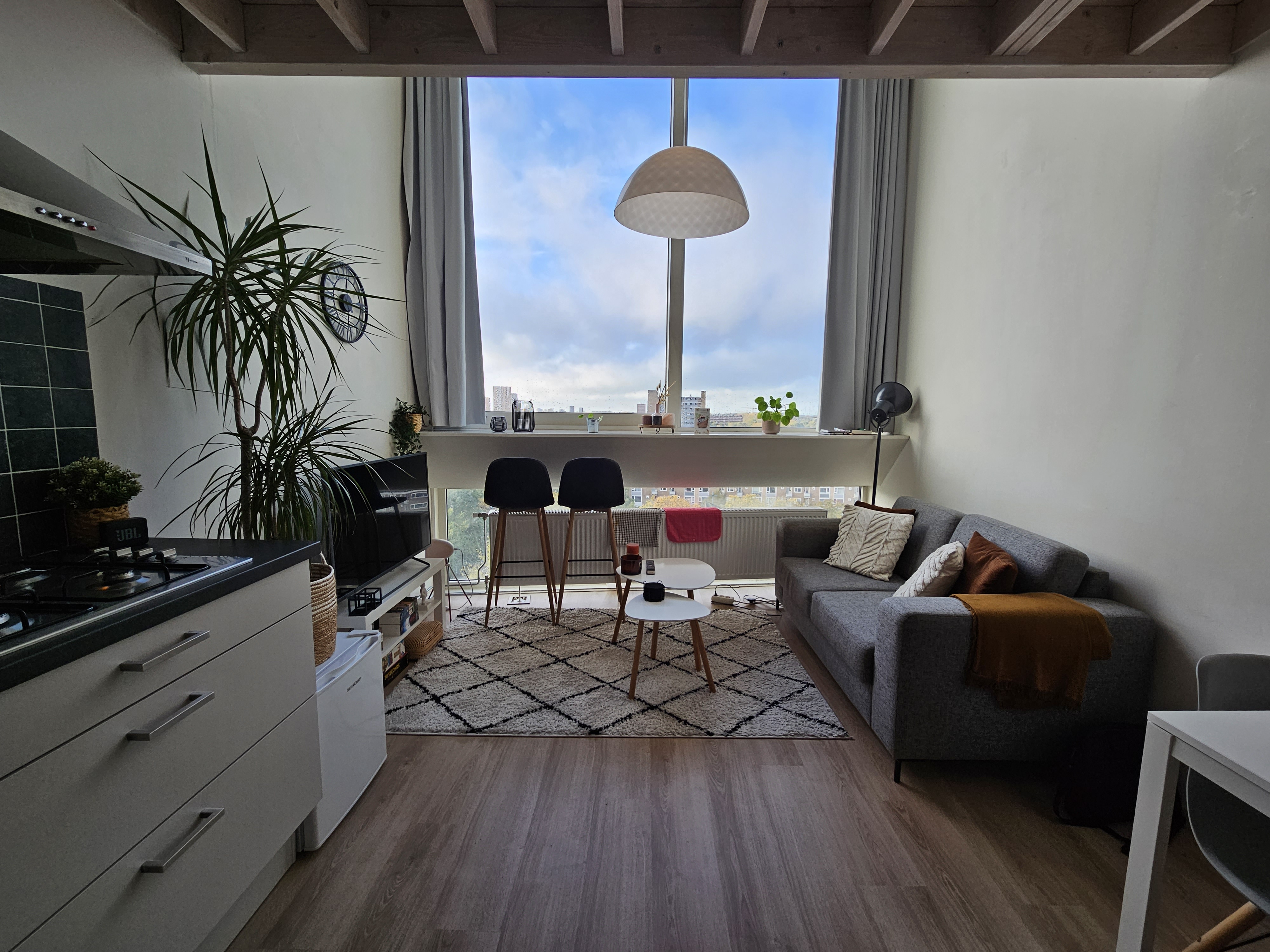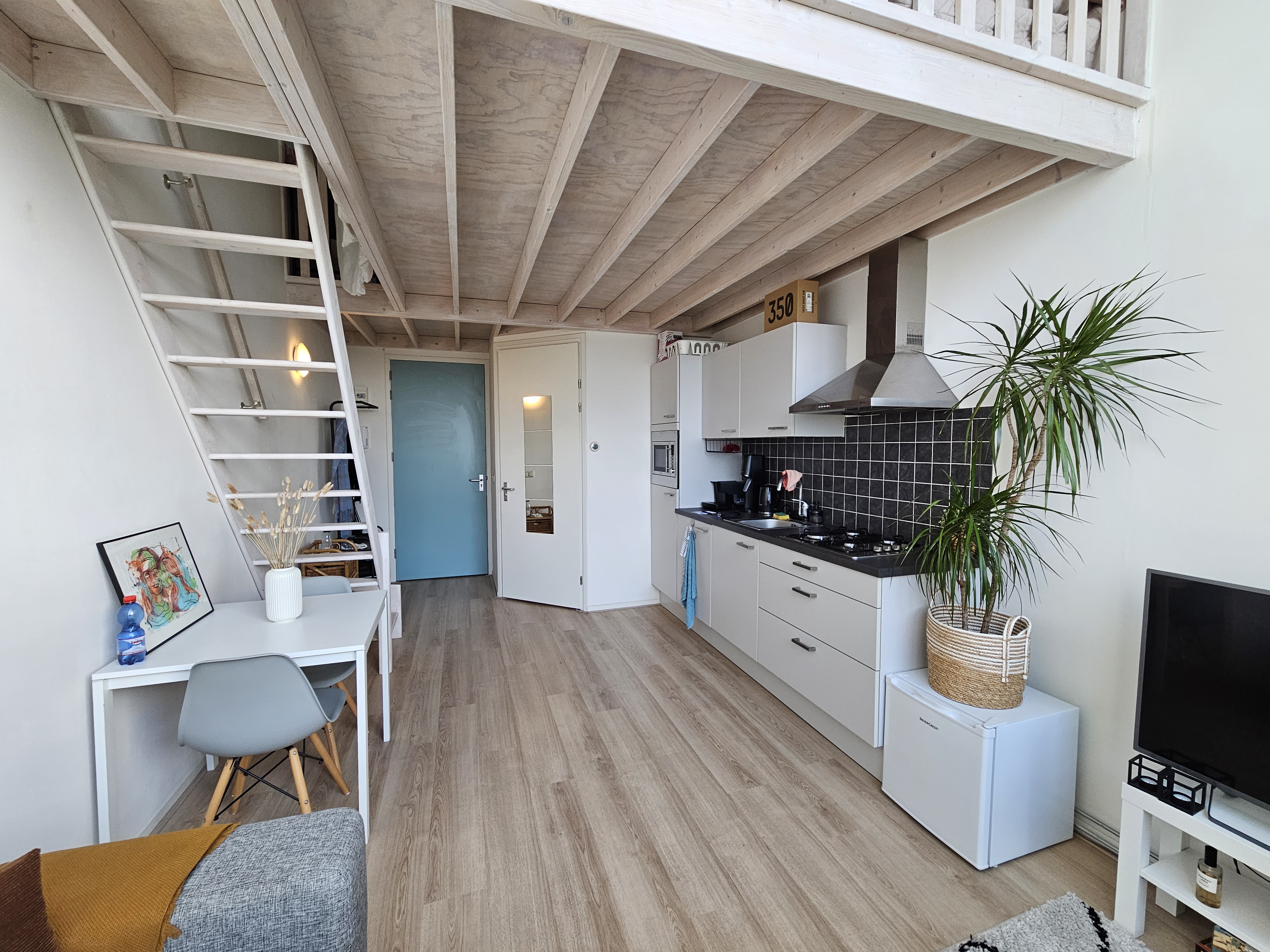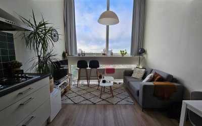 Gezamenlijke entree met liften wat toegang biedt tot de 10e etage van de studio. Bij binnenkomst tref je de woonkamer met open keuken van ca. 20m2 welke beschikt over diverse faciliteiten zoals een 4-pits gaskookplaat, combi-oven en koelkast. Daarnaast beschikt de woonruimte over een nette laminaatvloer, verduisterende gordijnen en een vide van ca. 15m2 wat ideaal gebruikt kan worden als slaapkamer. De badkamer is voorzien van een zwevend toilet, douche en wasbak. Verder is de woonruimte voorzien van een eigen HR combiketel, een ventilatie box en grote raampartijen waardoor je een prachtig uitzicht hebt!