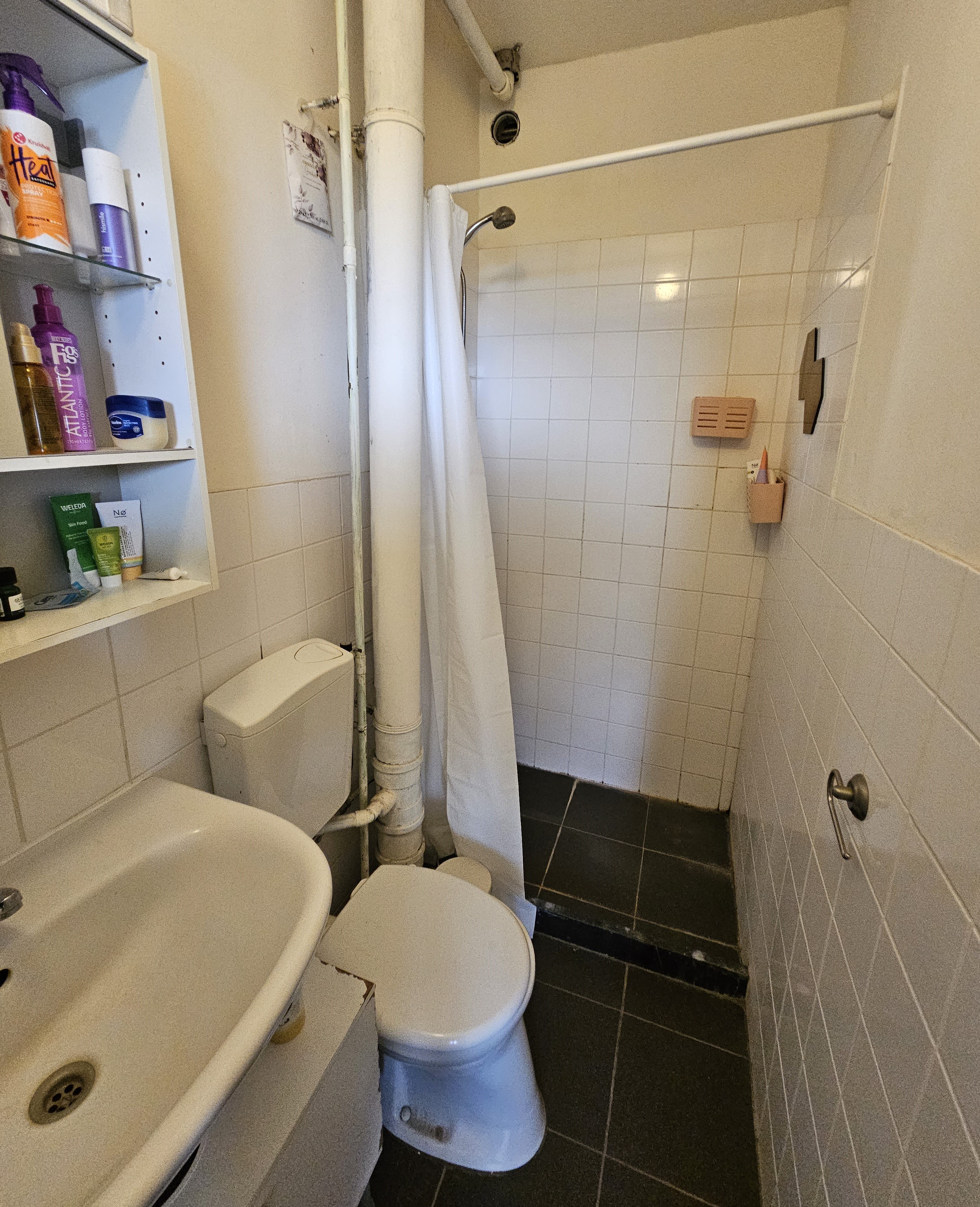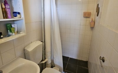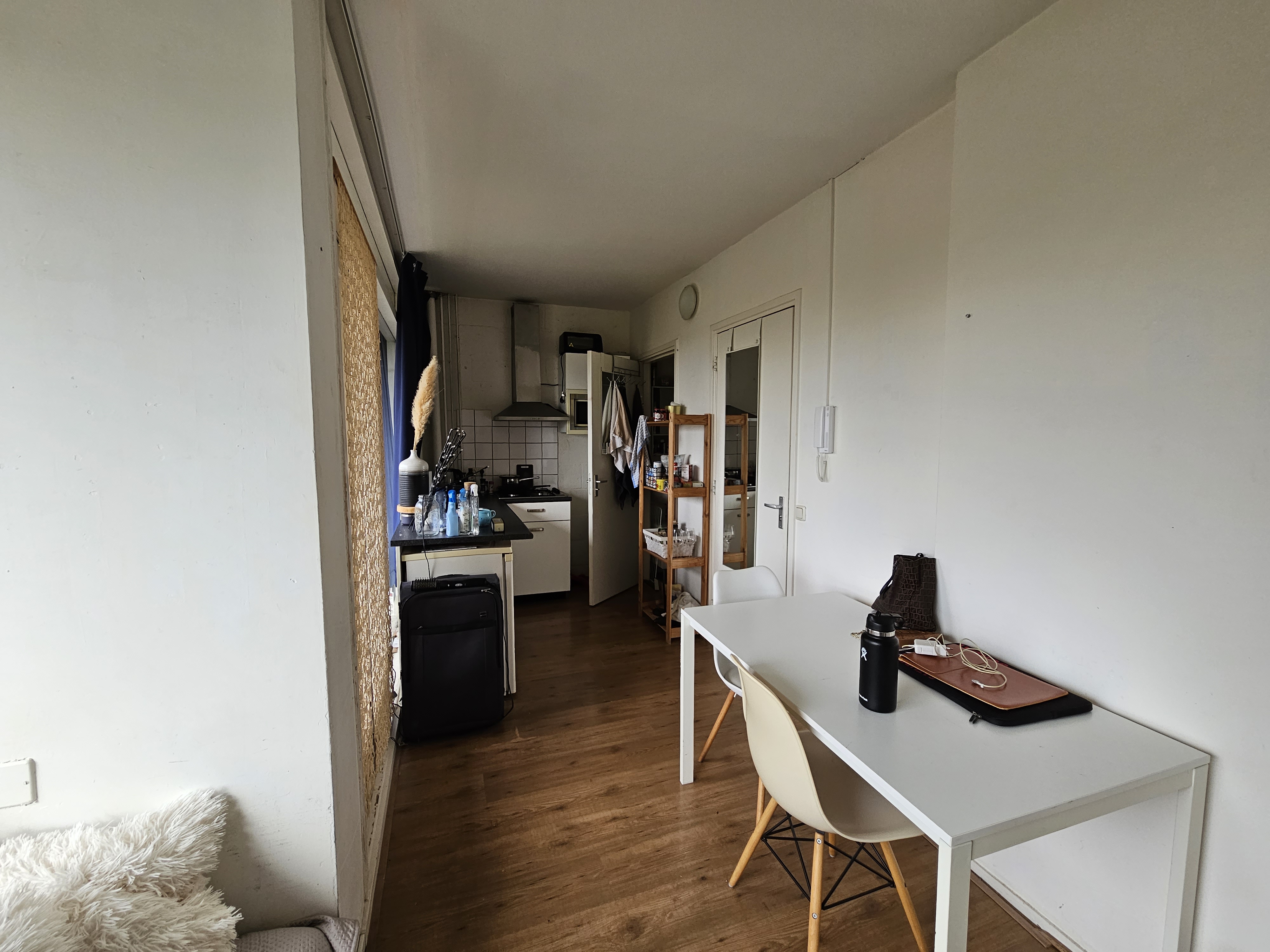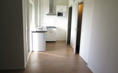 Gezamenlijke entree met een lift die toegang biedt tot de betreffende etage van de studio. Bij binnenkomst tref je de keuken welke beschikt over diverse faciliteiten zoals een 2-pits kookplaat, magnetron en koelkast. De badkamer is voorzien van een toilet, douche en wasbak. Verder is de gehele studio voorzien van een nette laminaatvloer, beschikt het over verduisterende gordijnen welke niet vervangen mogen worden en beschikt de studio over twee balkons.