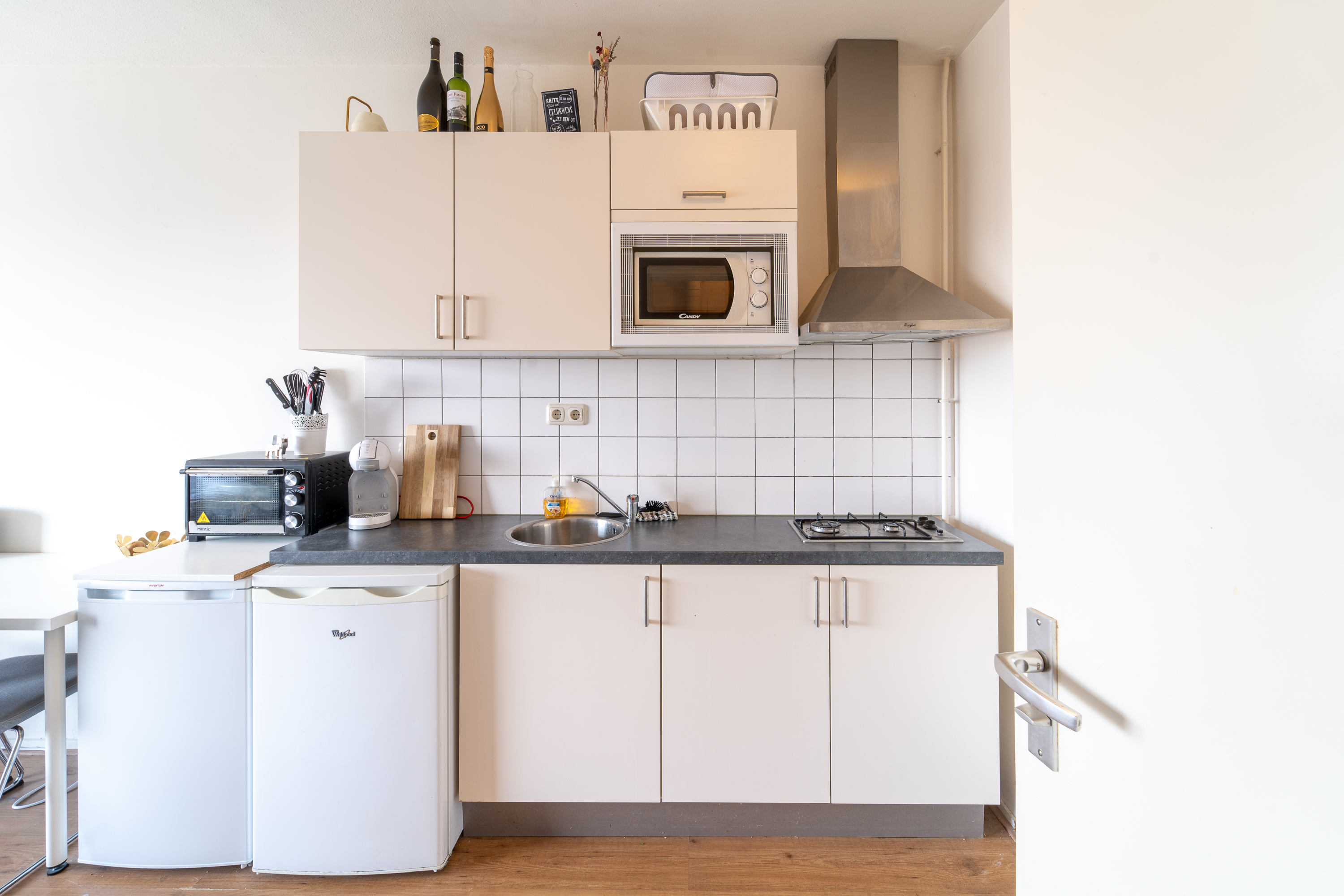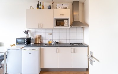 Gezamenlijke entree met een lift die toegang biedt tot de betreffende etage van de studio. Bij binnenkomst tref je de keuken welke beschikt over diverse faciliteiten zoals een inductieplaat, magnetron en koelkast. De badkamer is voorzien van een toilet, douche en wasbak. Verder is de gehele studio voorzien van een nette laminaatvloer, beschikt het over verduisterende gordijnen welke niet vervangen mogen worden.
