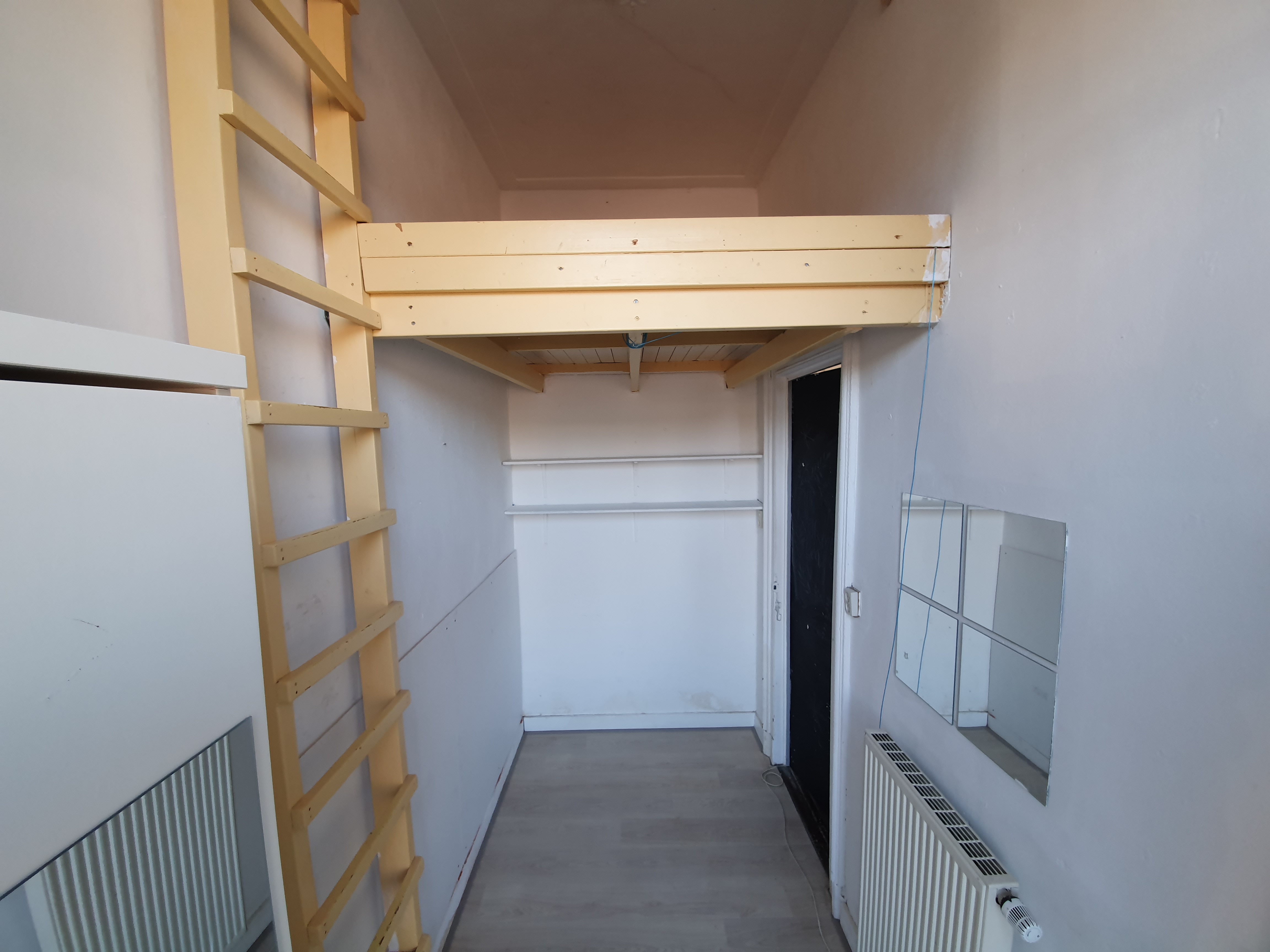 Bij binnenkomst neem je de trap naar boven. De kamer bevind zich op de eerste verdieping en is circa 10 m2. De bewoners delen in totaal twee keukens, twee toiletten, een badkamer en een berging met wasmachine en droger. Daarnaast heeft deze kamer een prive balkon aan de voorzijde van het pand.