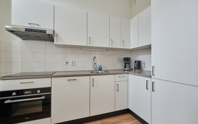 The apartment has a total living area of approximately 90 m² and features a smart layout that makes good use of the available space. The spacious living room of approximately 55 m² is bright and pleasant. The kitchen (6 m²) is fully equipped with modern appliances, including a built-in extractor hood, combination oven/microwave, refrigerator, induction hob, and dishwasher.