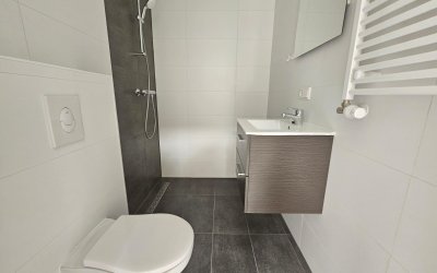 De badkamer is compact en functioneel ingericht en beschikt over een douche, toilet en wastafel.