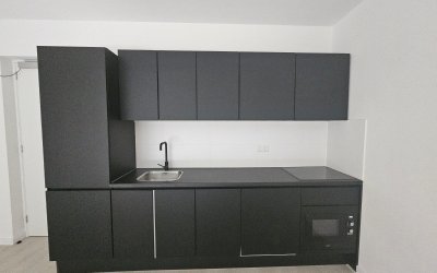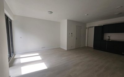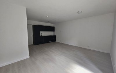 The studio has a living area of approximately 33 m² and features a bright living/sleeping area with an open kitchen. The kitchen is equipped with the necessary built-in appliances, including a hob, extractor hood, refrigerator, and combination oven/microwave.