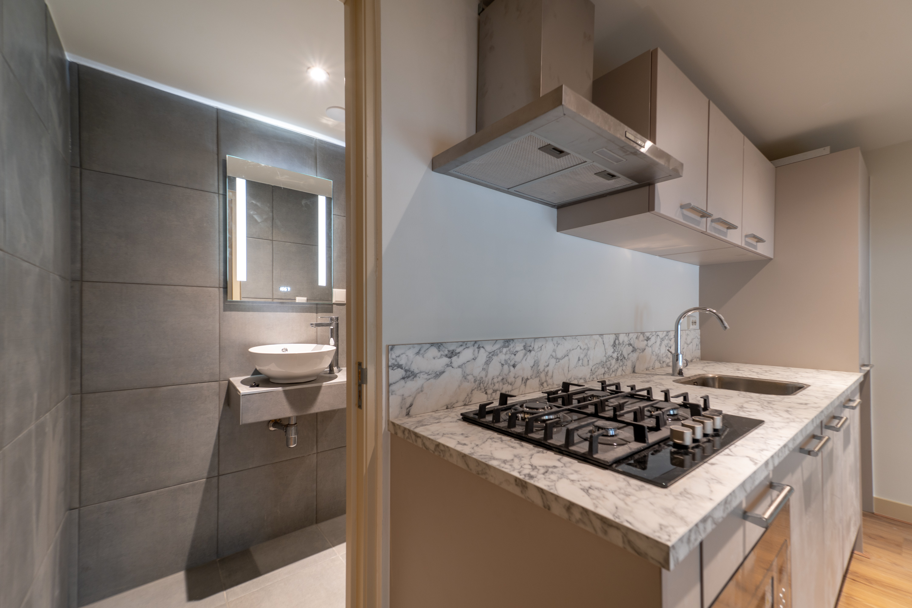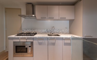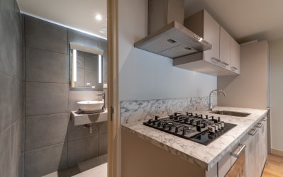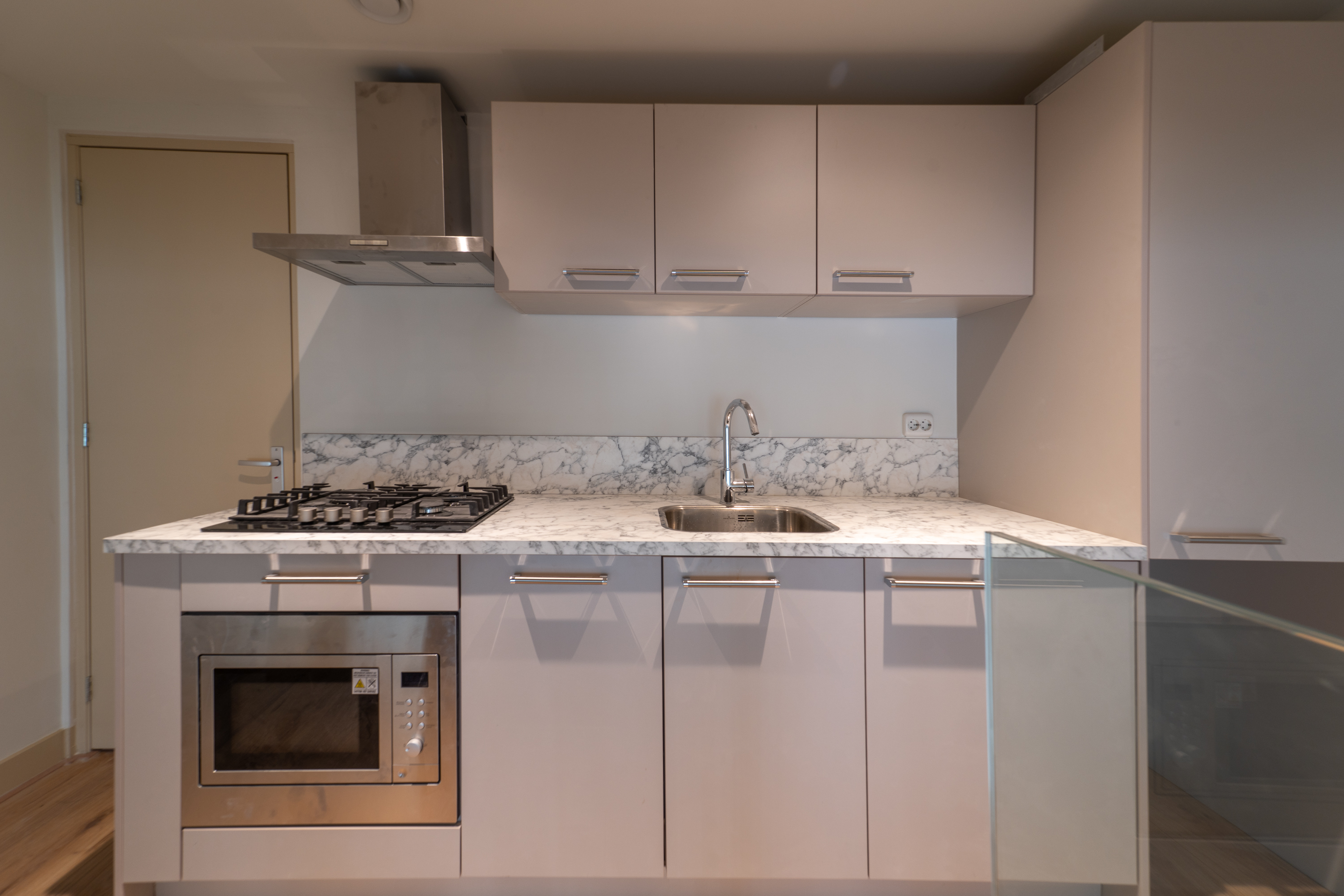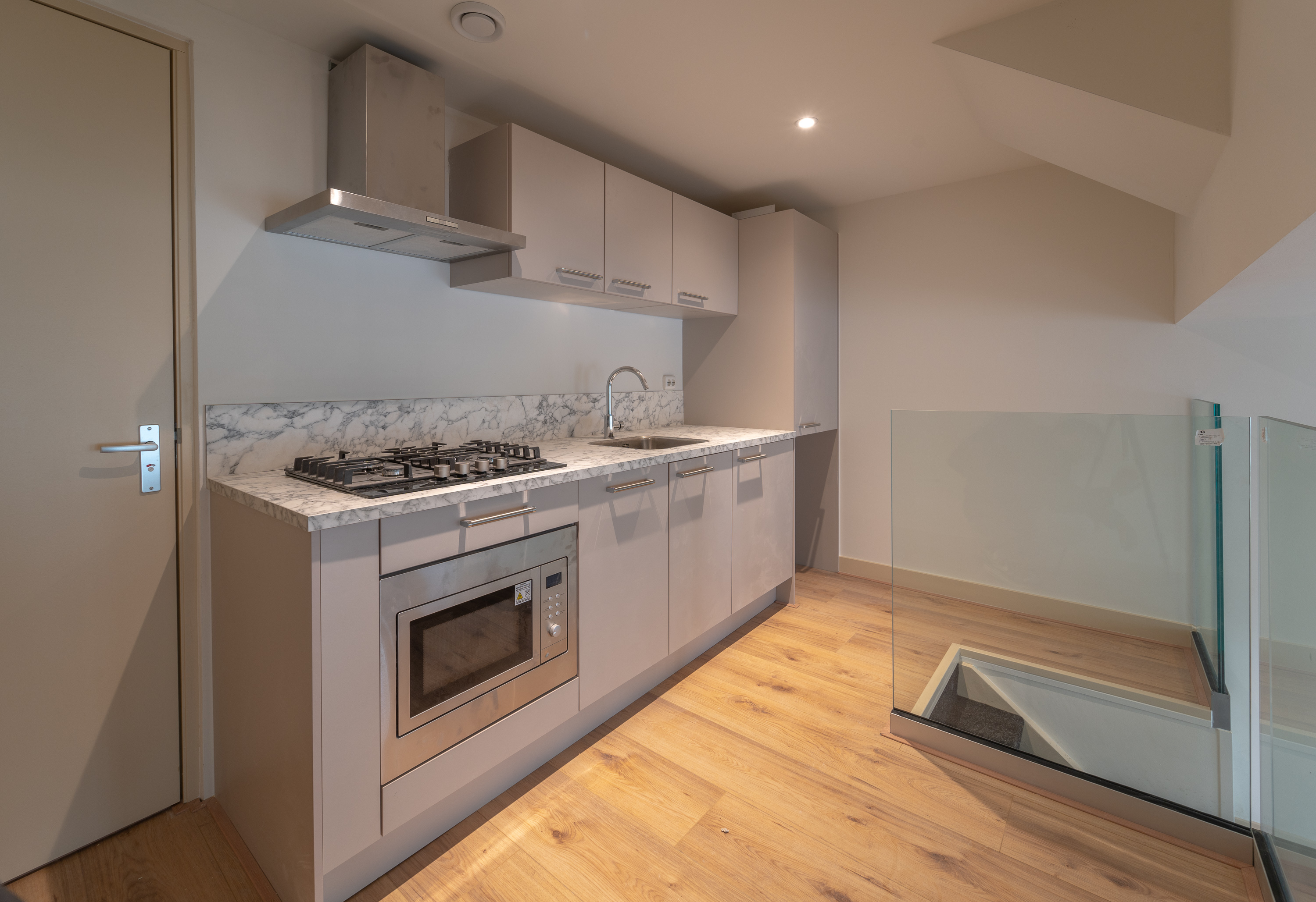 Bij binnenkomst betreed je de woon-/slaapkamer met open keuken van circa 24 m². De keuken is voorzien van diverse inbouwapparatuur, waaronder een gaskookplaat, afzuigkap, combi oven/magnetron en een koelkast. De aangrenzende badkamer van circa 3 m² beschikt over een inloopdouche, zwevend toilet, design radiator en een wastafel.
