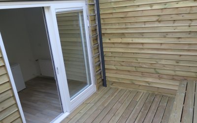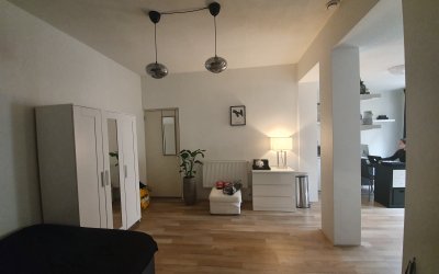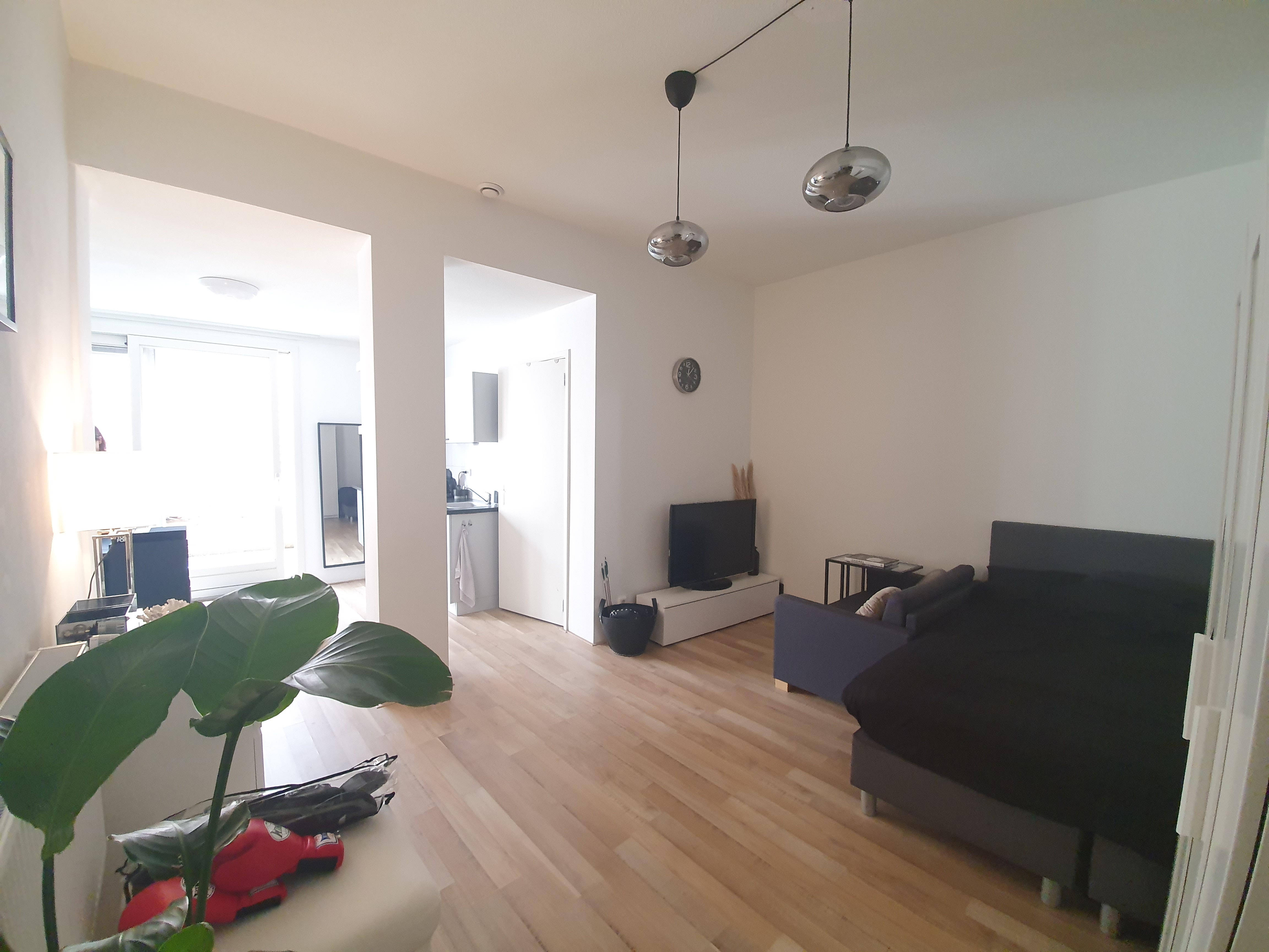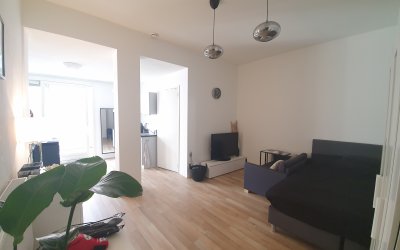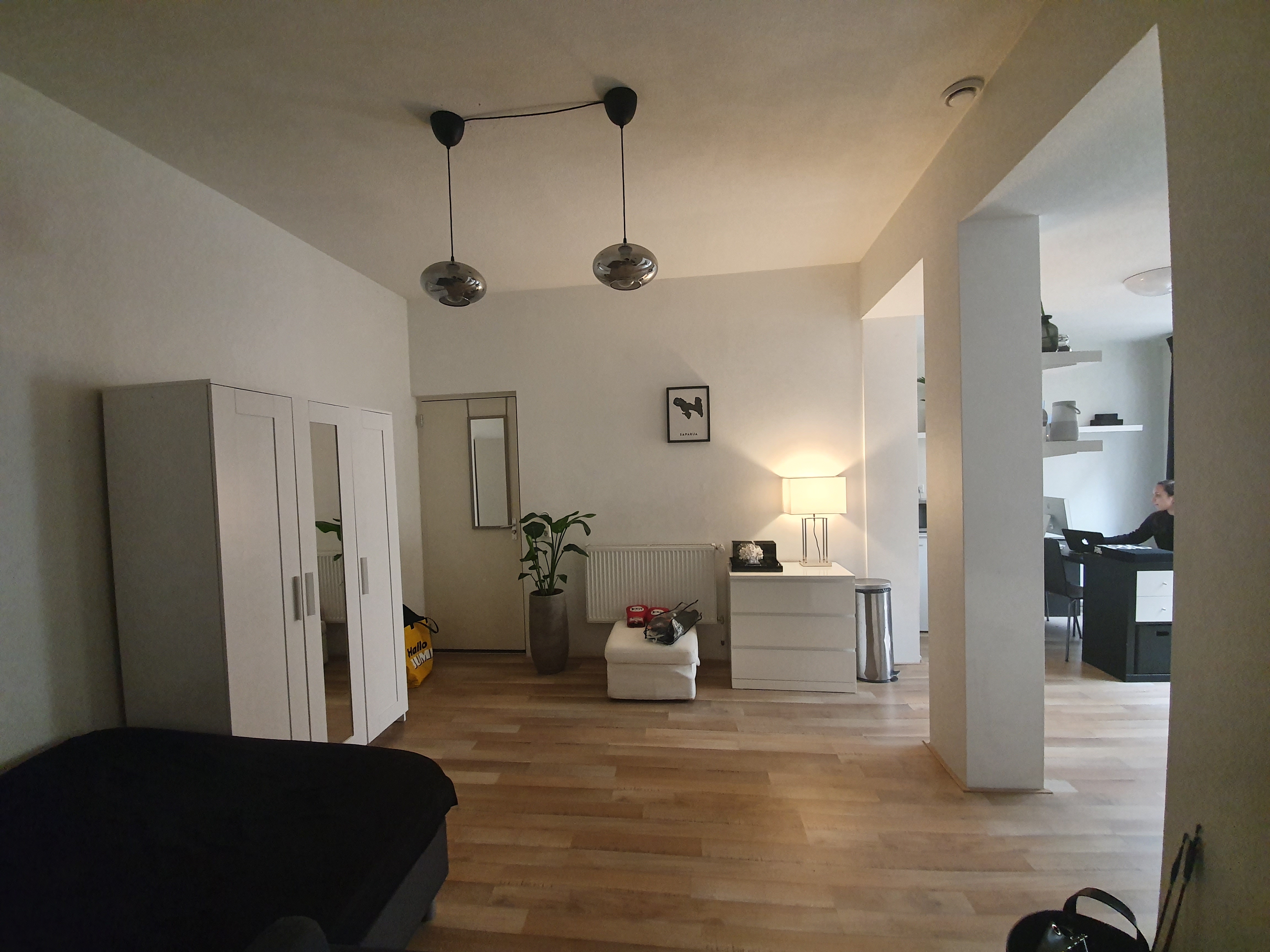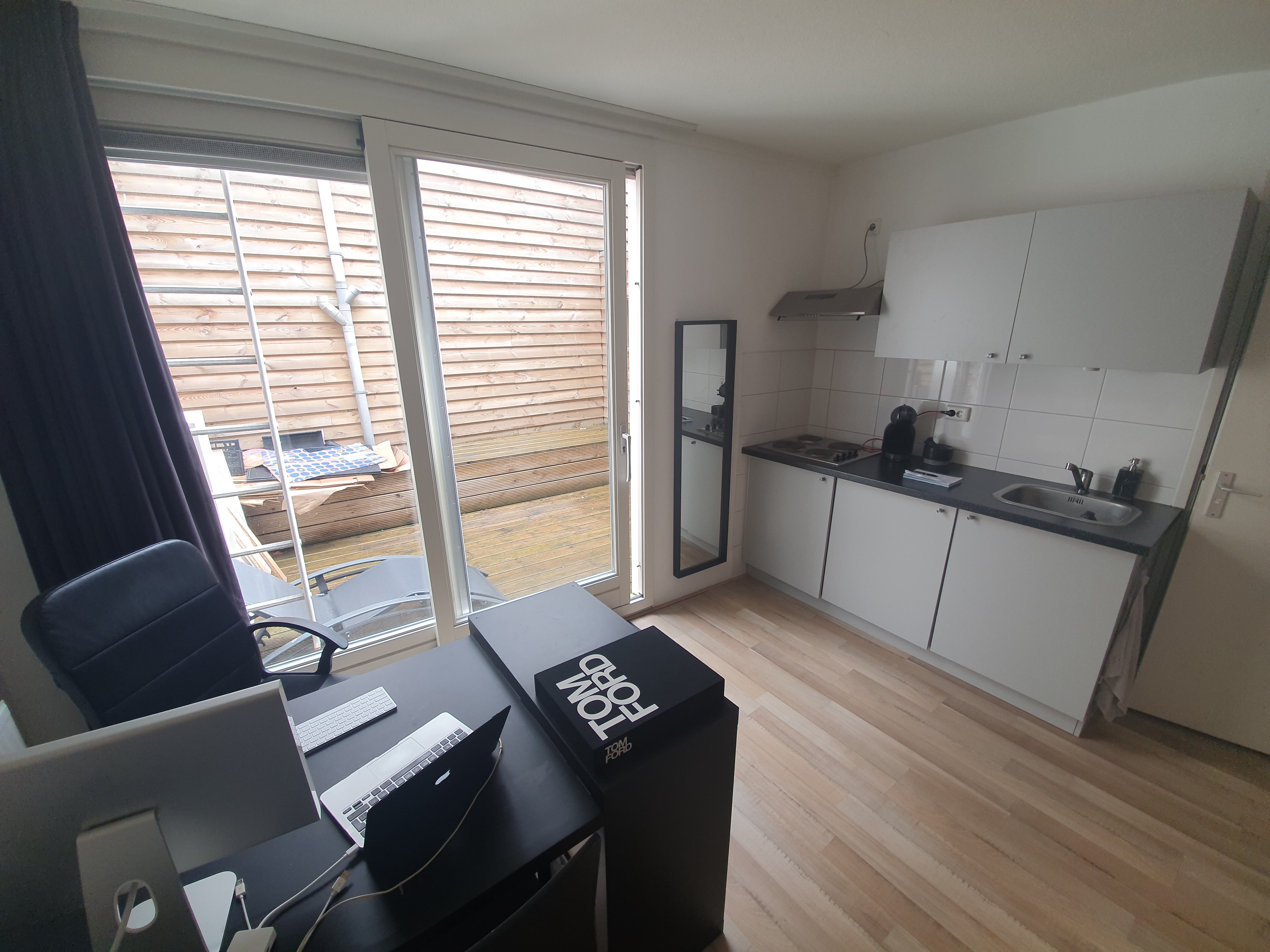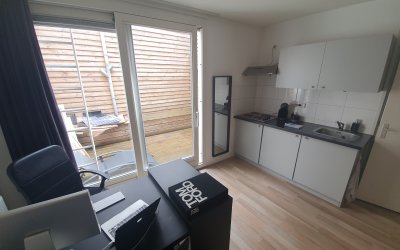 You enter through the shared entrance, from which you have access to the studio. Upon entering the studio, you step into the spacious living/sleeping area with an open kitchen, equipped with a 4-burner gas cooktop and an extractor hood. From the kitchen, you have access to the bathroom, which features a wall-hung toilet, washbasin, and a separate shower. From the living area, you can step directly into your private garden of approximately 11 m².