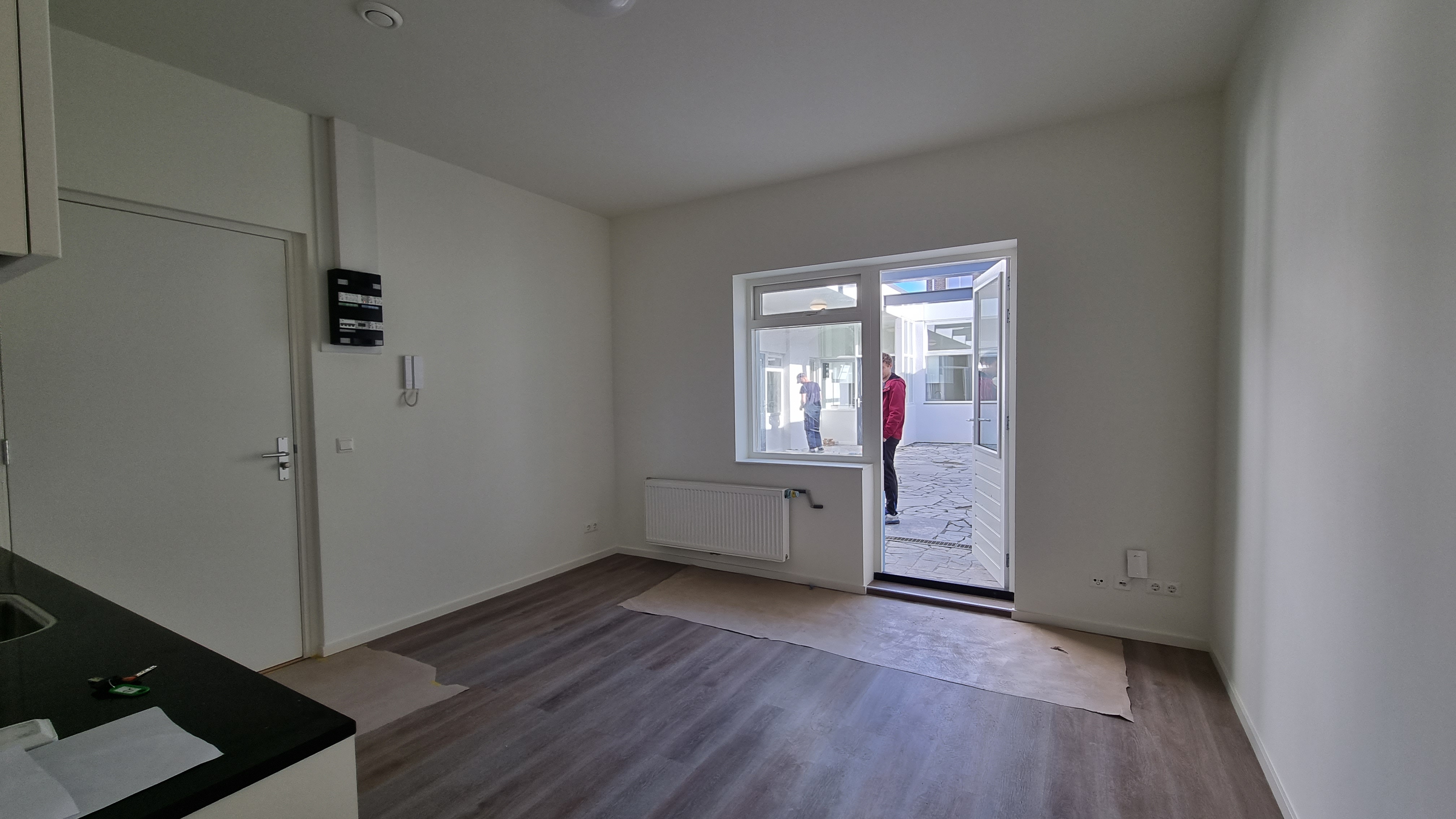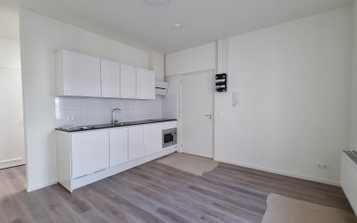 De woning beschikt over een woon-slaapkamer met open keuken van circa 26 m². De keuken is voorzien van moderne inbouwapparatuur, waaronder een afzuigkap, combi-oven/magnetron, koel-vriescombinatie, inductiekookplaat en vaatwasser.