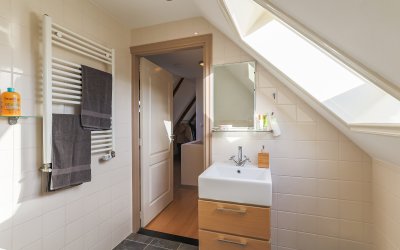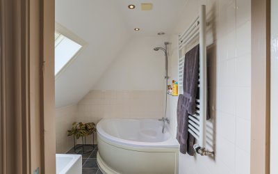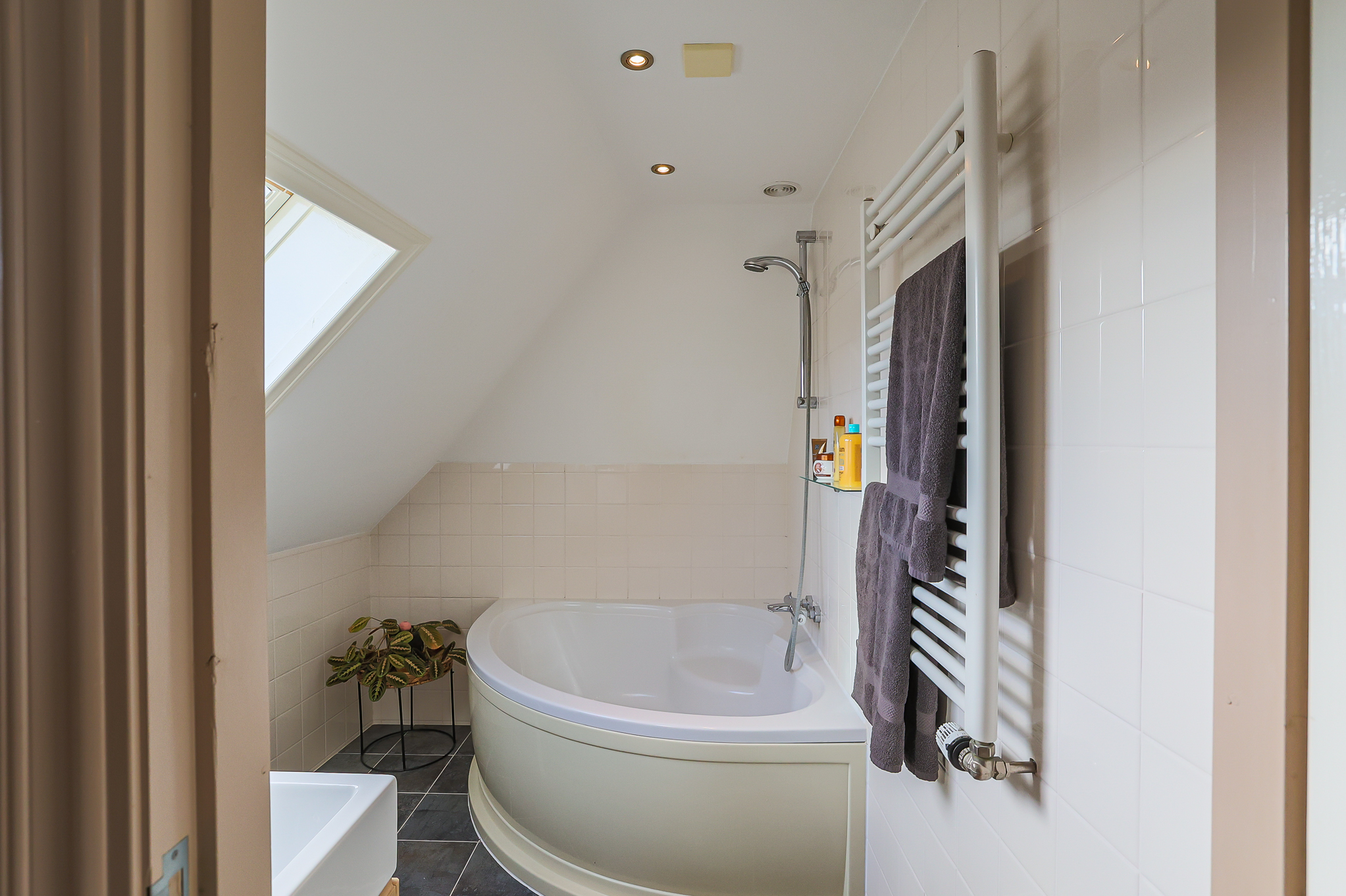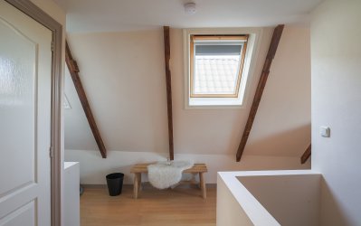 Op de tweede verdieping bevindt zich de slaapkamer met wasmachineaansluiting en de nette badkamer, voorzien van zowel een bad als een douche.