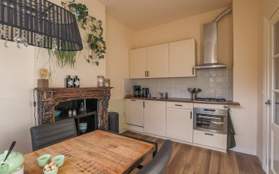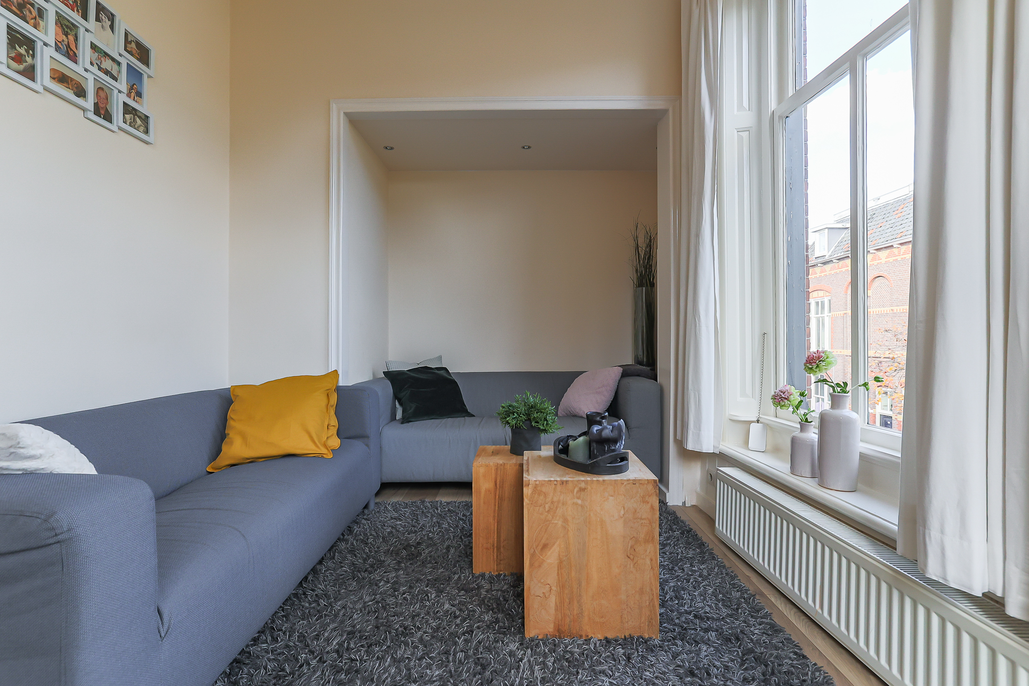 De bovenwoning is gelegen op de eerste en tweede verdieping en heeft een totale oppervlakte van circa 60 m². Je bereikt de woning via een vaste trap naar de eerste verdieping. Hier bevindt zich de sfeervolle woonkamer met open keuken, voorzien van veel kastruimte, ingebouwde afzuigkap en een 4-pits gaskookplaat. Ook vind je hier een separaat toilet en de trapopgang naar de tweede verdieping.