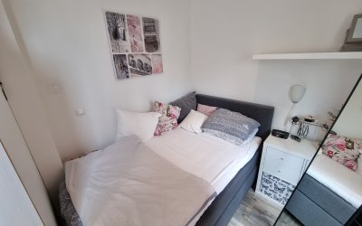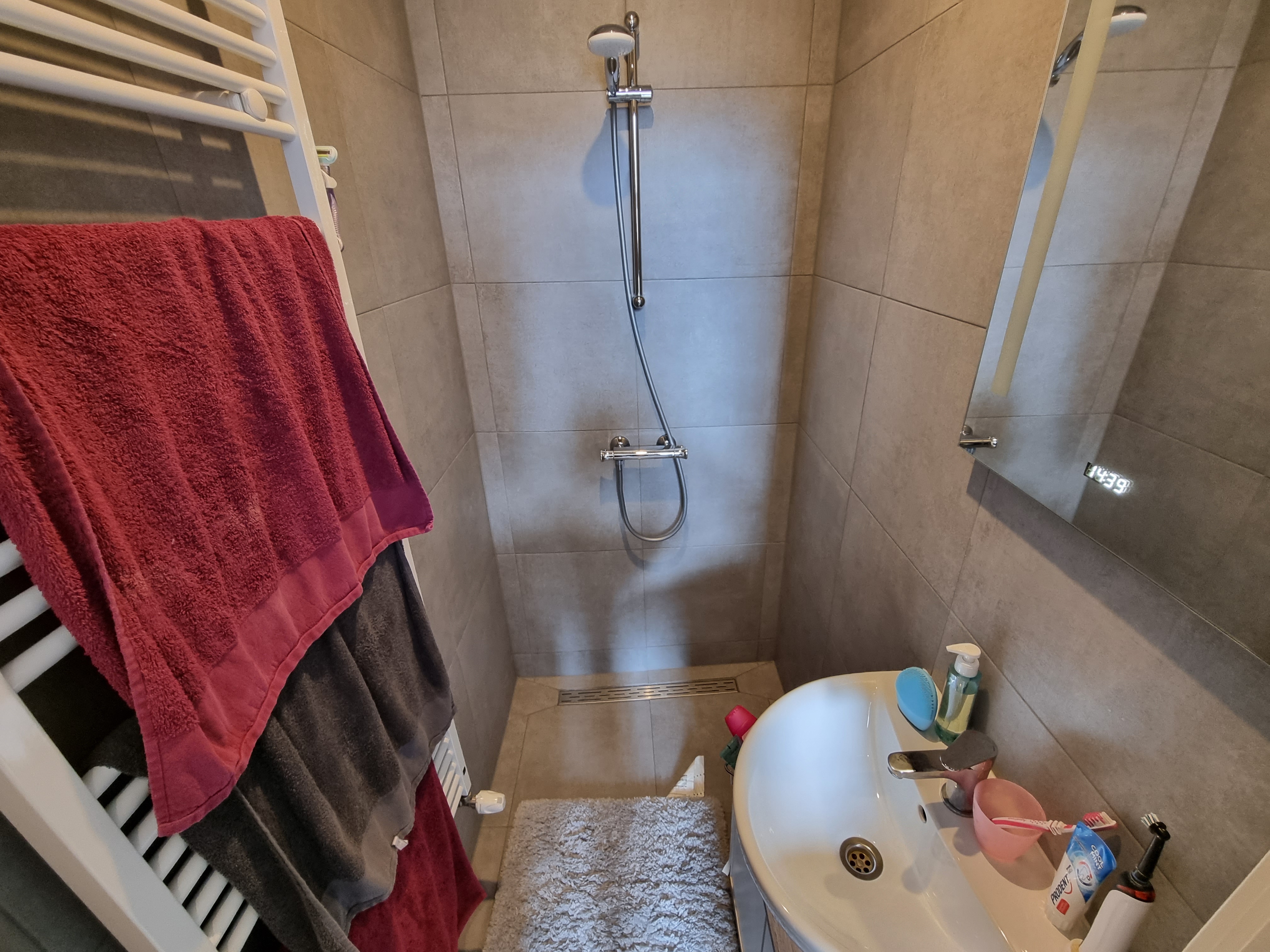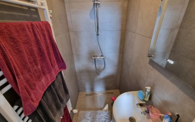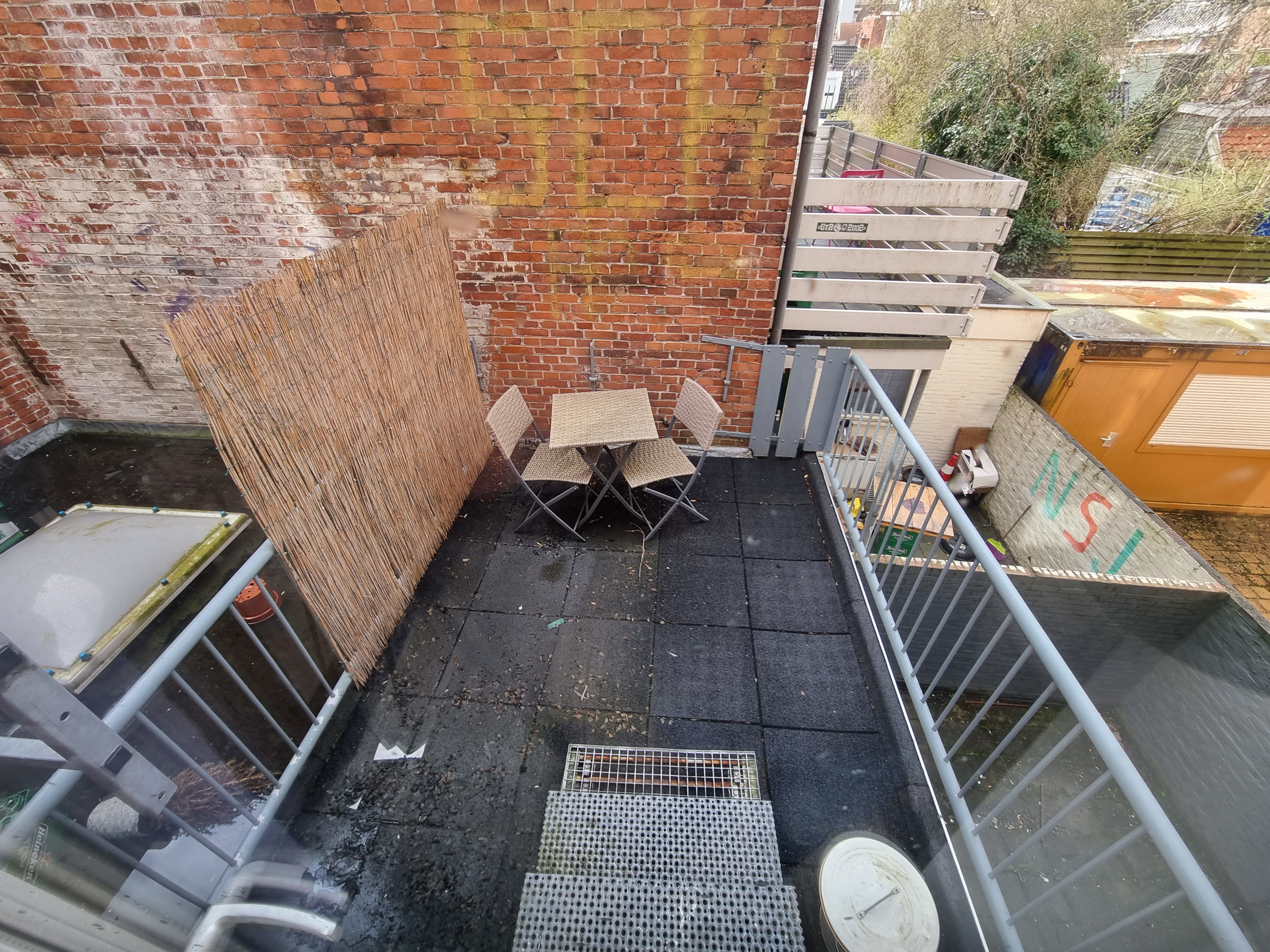 De studio is gelegen aan de achterzijde op de 1e etage van het pand. De woonkamer met open keuken beslaat ca. 18m2. De keuken beschikt over een 4-pits gaskookplaat met afzuigkap, koel-/vriescombinatie, combi-magnetron, vaatwasser en wasmachine aansluiting. De badkamer is tot aan het plafond betegeld. Zowel de vloer als de wanden zijn met antraciet grijze tegels bedekt. Dit zorgt voor een luxe uitstraling. De studio heeft een klein balkon.