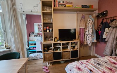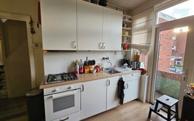 De kamer bevind zich op de eerste etage, hij is maar liefst 16 m² groot en heeft een eigen balkon van circa 3 m². De keuken, het toilet en de badkamer worden gedeeld met twee vrouwelijke huisgenoten. De keuken is 15 m² en voorzien van diverse inbouwapparatuur, zoals een gaskookplaat, afzuigkap, koelkast en oven. Daarnaast is de badkamer uitgerust met een inloopdouche en een designradiator. Het toilet is apart gelegen van de badkamer.